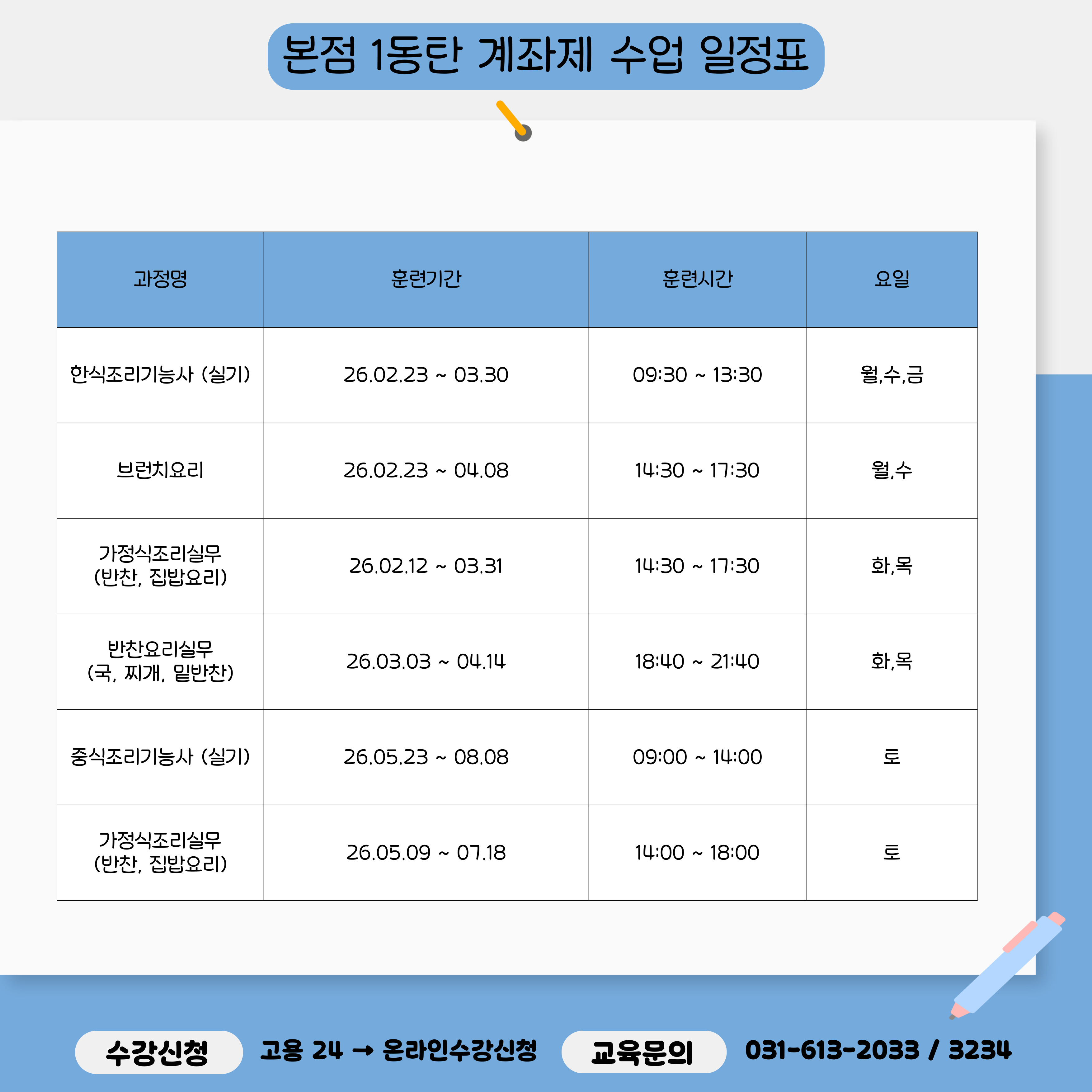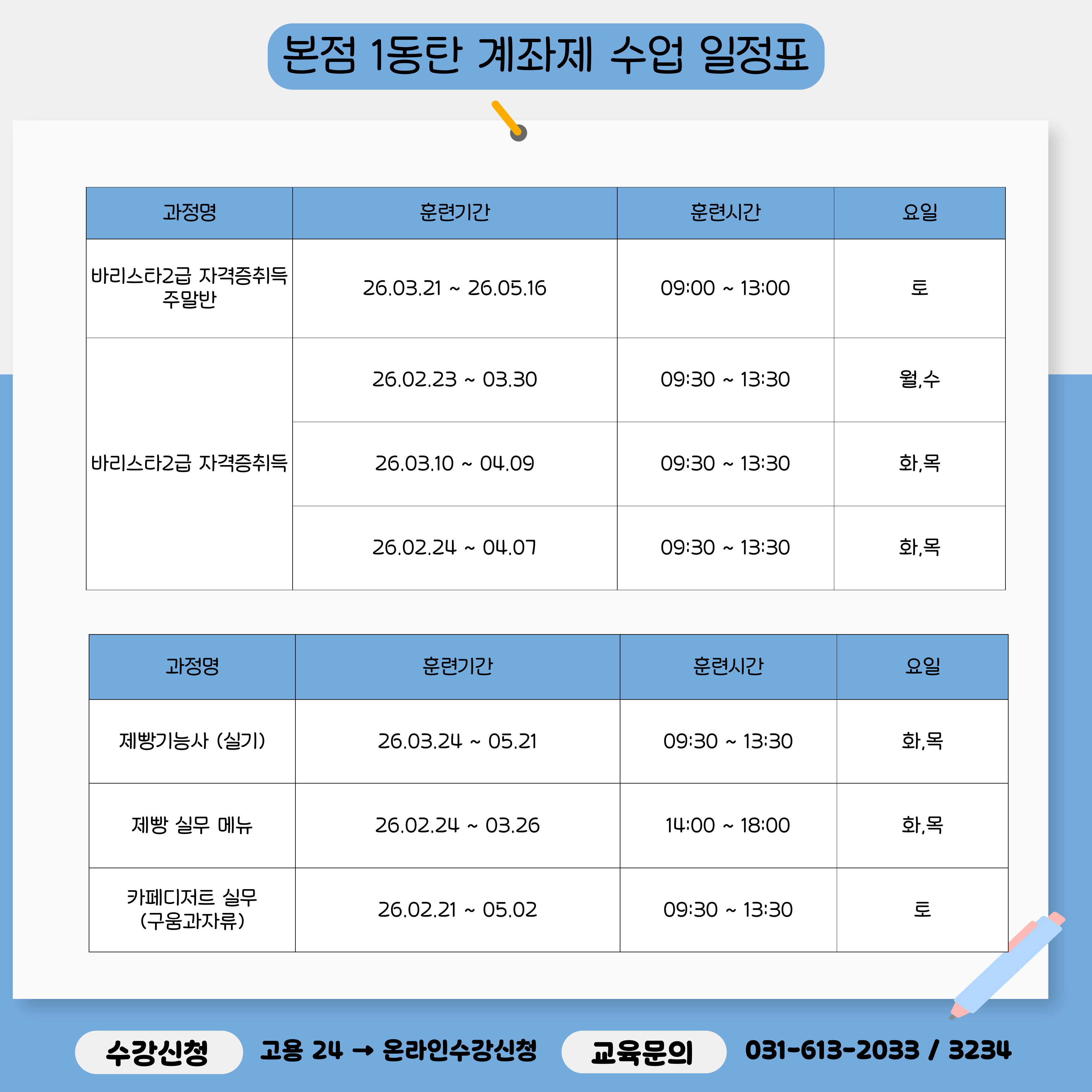 [점 국비과정 일정표]국비과정 일정표입니다!내일배움카드 / 일반등록 가능자세한 일정 및 수강 문의는 본원으로 연락주세요.또한, 일정표에 없는 과목도 차기과정으로 계속 업데이트 될 예정입니다 ! 연락주시면 차기과정 안내와 과정 개설에 적극 반영하겠습니다 ! 본점 문의전화 : 031-613-2033위치 : 경기도 화성시 동탄문화센터로61, 아시아프라자 2층.6층
