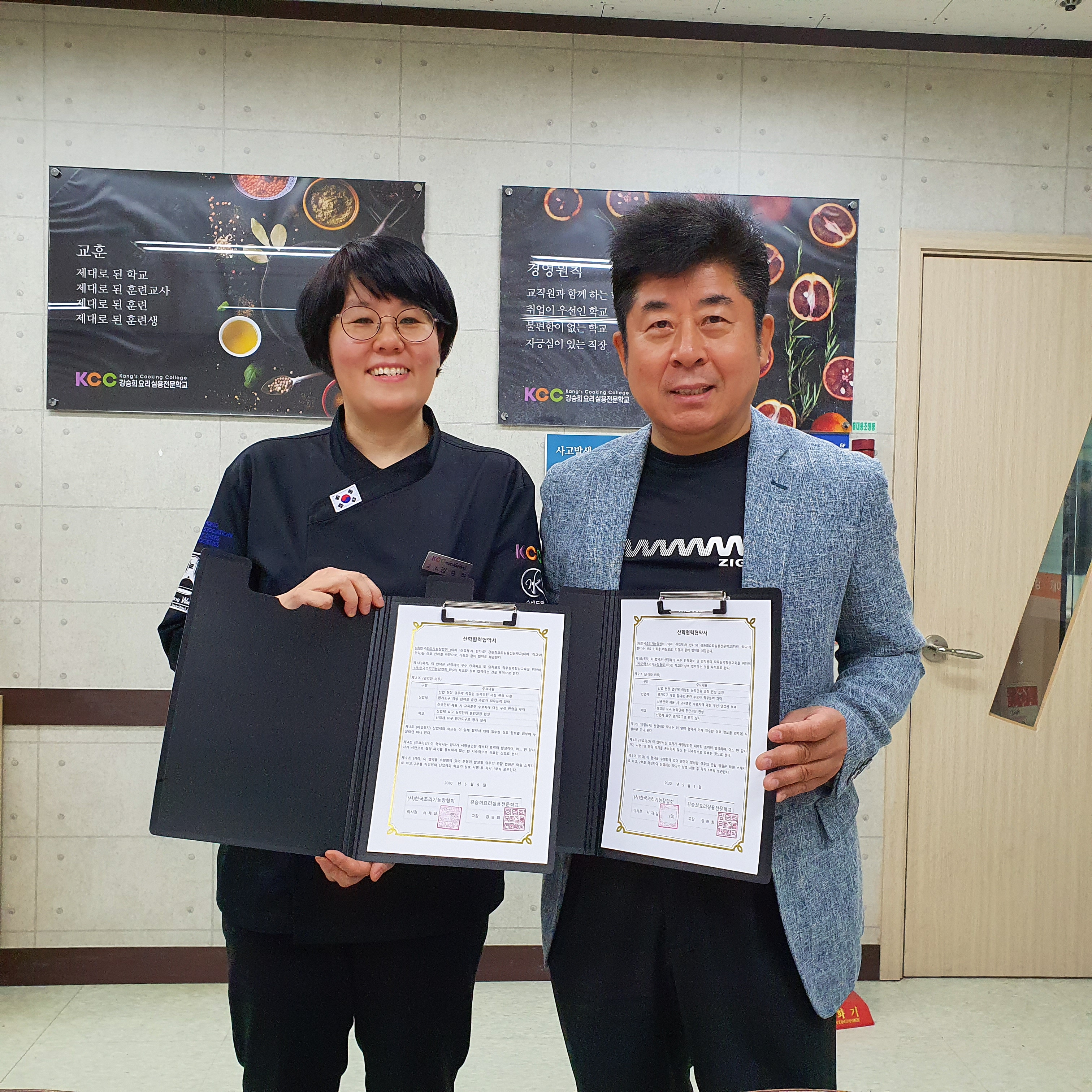 강승희요리실용전문학교와 (사)한국조리기능장협회는 산업체의 우수한 인력확보 및 임직원의 직무능력교육을 위하여 상호 협력을 목적으로
