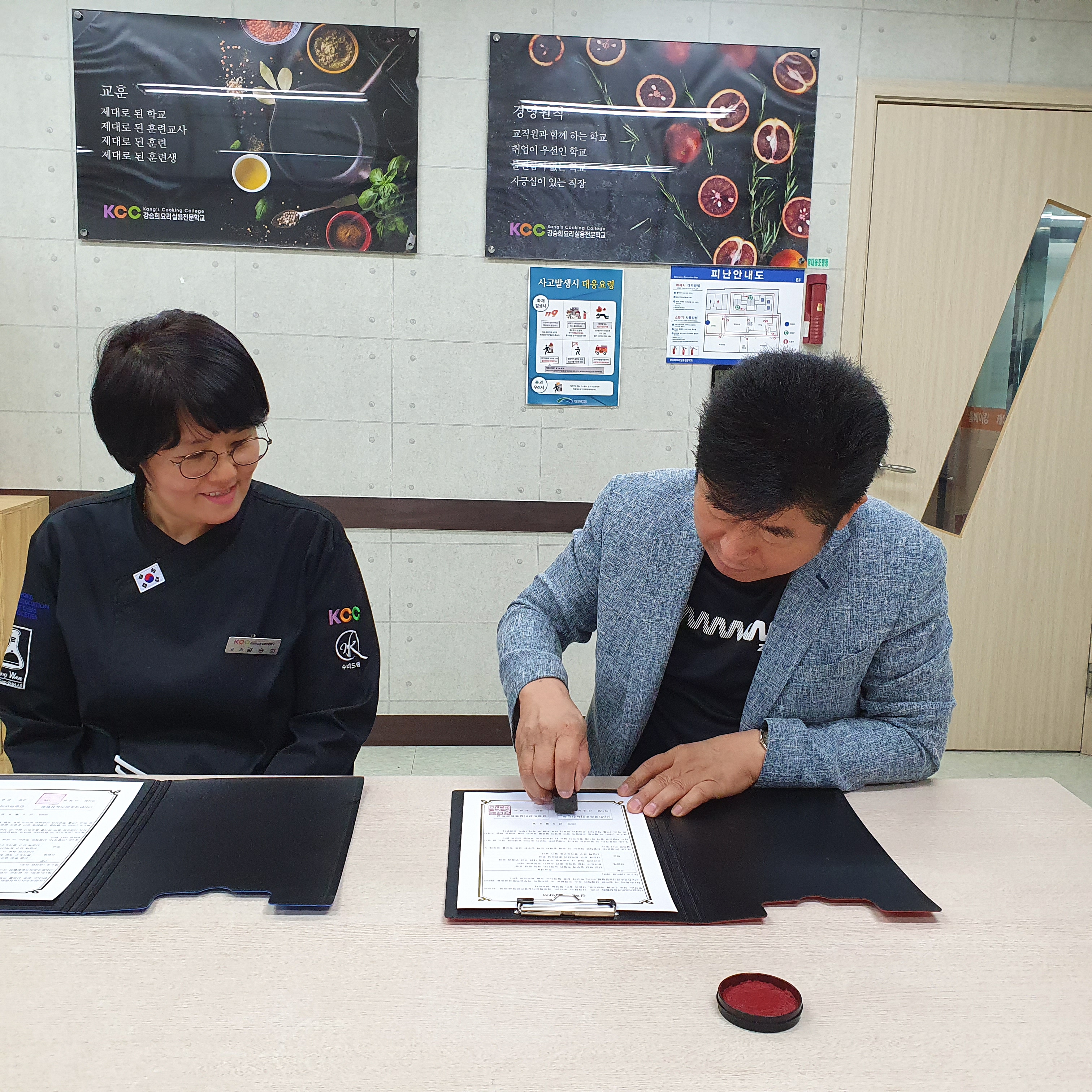 이날 협약식에는 (사)한국조리기능장협회 서재실 이사장님과 강승희 요리실용전문학교에 강승희 학교장등이 참석하였습니다.